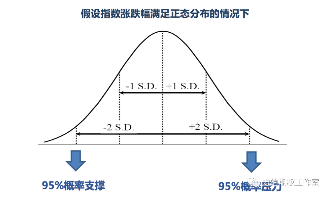 在7月初的时候,我曾经发过一篇《今年下半年,为什么说“价波共振”很重要?!》,其中提到过一种“压力、支撑”位的估算方法。这里,我们一起回顾一下,假设当前指数落在S的点位,主力月份平值认购隐波是call_sigma,平值认沽隐波是put_sigma,于是: