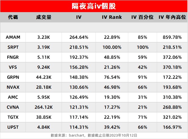 3、其他个股如 $AMAM 、 $TGTX 、 $UPST 等隐含波动率也较前一交易日浮动较大。