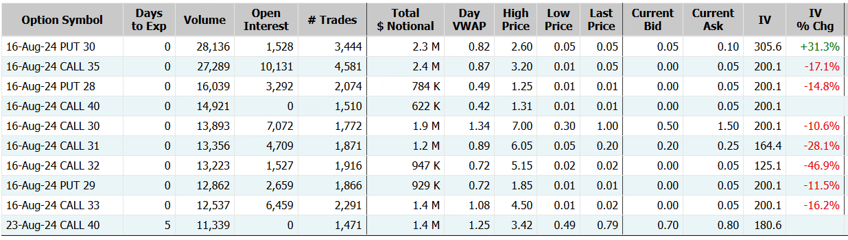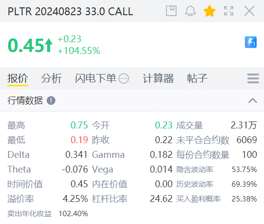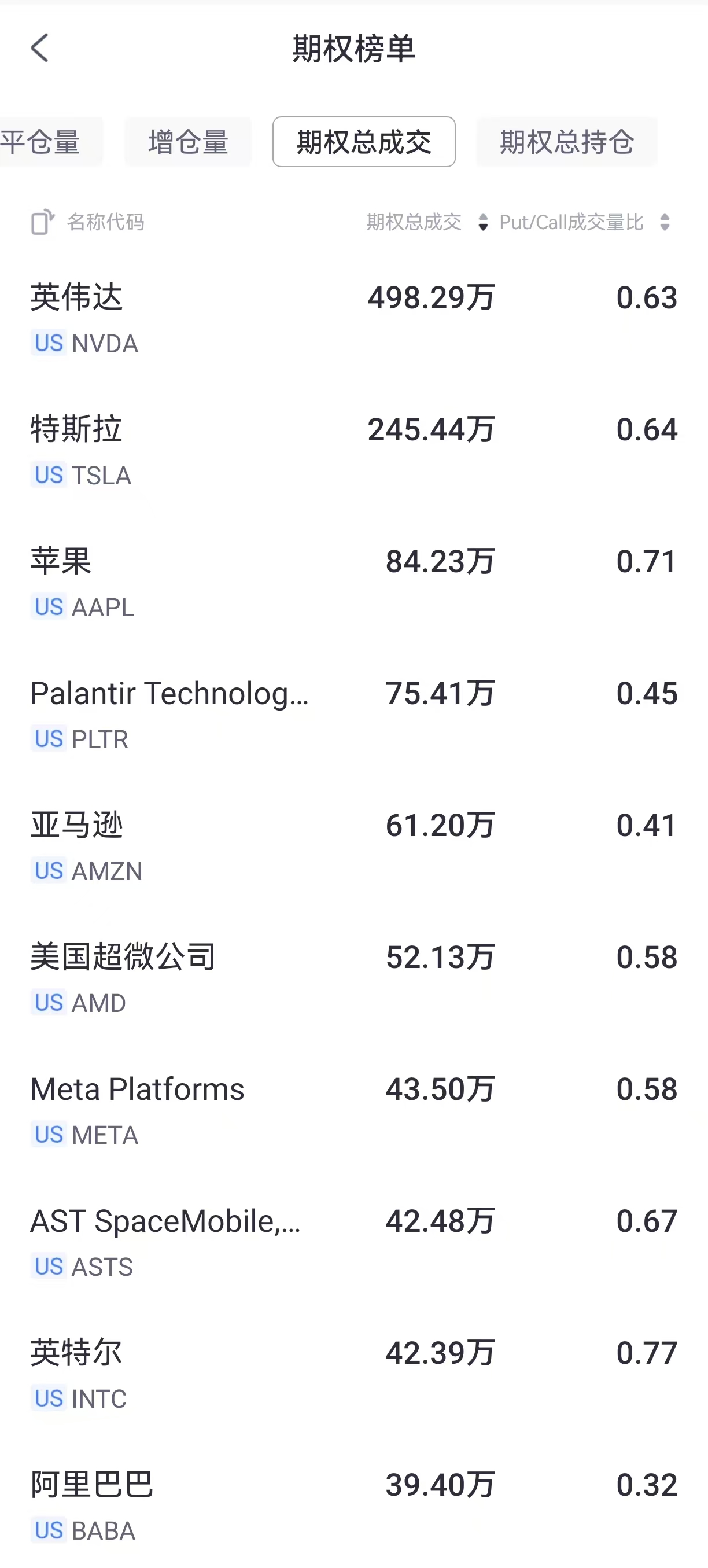 一、市场概览 上周五美股三大指数齐创今年最大单周涨幅,截至收盘,标普500指数涨0.2%,纳斯达克指数涨0.21%,道琼斯工业指数涨0.24%。 期权市场总成交量达44,733,997张合约,高于90天均值,其中,看涨期权占比59%。标普指数ETF-SPY期权成交737.7万张合约,其中,看涨占比仅43%。 二、期权总成交TOP10科技巨头上周的亮眼涨势,让市场继续对他们的前景维持乐观,占据成交榜前两位的 英伟达 和 特斯拉 看涨期权成交量占比都超过了60%。 具体来看, 英伟达 期权成交量达498.29万张,未平仓合约总计约2,983.55万张,与其近30交易日均值比为102.54%。特斯拉期权成交量达245.44万张,未平仓合约总计约748.31万张,与其近30交易日均值比为97.2%。 苹果 期权成交量达84.23万张,未平仓合约总计约692.08万张,与其近30交易日均值比为102.65%。 Wedbush分析师Dan Ives表示,此前 Palantir与微软签署了一项协议,为国防和情报界提供人工智能服务,这可能会“改变游戏规则”,并可能成为Palantir人工智能平台(AIP)的“发射台”。该行维持了对Palantir的增持评级和38美元的目标价,距最新收盘价还有接近20%的上升空间。 三、异动观察值得注意的是,在上周四创纪录大涨50%之后,公司股价周五有所回调,期权风向同样有所反转,虽然看涨期权成交量占比仍在60%,但期权链上成交量前三中有两个都是看跌期权: 中概股 阿里巴巴 在发布业绩后期权成交量也冲上了前十榜单,期权合约成交量达39.4万张,较90日均量放大2.2倍,此外阿里巴巴也是榜单上Put/Call成交量比最低的一只个股,仅为0.32,市场对其绩后股价走势前景仍相当看好。 公司周日表示,它已发射了第52枚电子火箭,并将一颗Capella Space卫星送入低地轨道,并表示其下一次发射日期将 “在未来几天内” 公布。其股价过去两个交易日累计上涨26.64%。