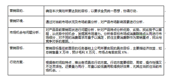 技能描述 营销策划书,也称营销策划方案,是营销策划的文字报告形式。文案的篇幅要与策划的内容繁简相一致,文案的形式要图文并茂,文案的结构要严谨、完善、层层递进、环环相扣、彼此照应。 一、营销策划书撰写原则 为了提高策划书撰写的准确性与科学性,应首先把握其编制的几个主要原则。 1.层次分明。按照逻辑性思维的构思来编制策划书。首先交待策划背景,分析产品部市场现状,再把策划中心目的全盘拖出;其次进行具体策划内容详细阐述;再次明确提出解决问题的对策。 2.针对性强。策划的目的在于解决企业营销中的问题,抓住所要解决的核心问题,深入分析,提出可行性的相应对策。 3.可操作性强。编制的策划书是要用户指导营销活动,其可操作性非常重要。不能操作的方案创意,再好业务任何价值。不易于操作,必然要耗费大量人、财、物,管理复杂,显效低。 4.创意新颖。要求策划的“点子”(创意)新、内容新、表现手法也要新,给人以全新的感受。新颖的创意是策划书的核心内容。 二、拟定策划方案的步骤 连锁经营营销策划方案的拟定,应依照下列步骤进行: 1.确定目标主题。将策划的目标主题确定于一定时空范围之内,力求主题清晰,重点突出。 2.收集资料。围绕目标主题,通过多种方式收集信息资料。 3.调查市场态势。围绕目标主题,进行全面的市场调查,掌握第一手资料。 4.整理资料情报。综合市场调查的第一手资料片和现成的第二手资料,整理成为对目标主题有用的情报。 5.提出具体创意。根据实际需要,提出有关营销策划的新的创意。 6.选择可行方案。将符合目标主题的创意,变成具体的执行方案。 7.制定实施细则。根据选定的方案把各功能部门和任务加以详细分配,分头实施,并按进度表与预算表进行监控。 8.制定检查方法。对策划的方案提出详细可行的检查方法和评估标准。 写作格式与方法 营销策划方案的编制,一般由下述几方面内容构成。 1.封面 封面一般应该提供以下信息:策划书的名称、委托策划的客户、策划机构的名称和策划人的姓名、策划负责人及其联系方式、策划完成日期、策划执行的时间段以及编号。封面制作的要点如下: https://pic2.zhimg.com/v2-a24c6c7eaf24d62013a584f742760125_b.png友情提醒:封面的设计应该醒目、简洁、切忌花哨,字体、字号颜色则应该根据视觉效果具体考虑。 2.前言 前言一方面是对内容的高度概括性表述,另一方面可以引起阅读者的注意和兴趣。字数可以控制在1000字以内,其内容主要有:接受委托的情况,如XX公司接受XX公司的委托,就某年度的广告宣传几乎进行具体策划;策划的概况,即策划要达到的目的以及策划的主要过程。 3.目录 目录是策划书各部分标题的清单,帮助阅读者了解全书概貌和方便的查找相关内容。目录的编制要下一点工夫,既要让人读后能够了解策划书的全貌,又要能够激起人们的阅读兴趣。 友情提醒:列目录时要注意,目录中所标页码与实际页码必须一致,否则会影响营销策划书的形象。 4.摘要 摘要是对营销策划项目所作的一个简单而概括的说明。摘要需要说明策划对象、策划目的、解决问题、结论等。阅读者通过摘要的提示,可以大致了解策划内容的要点。 摘要虽然是在营销策划书的最前面,但它一般是在整个营销策划做完以后才写出来的。内容要求简明扼要,篇幅不能过长。 5.正文 这是营销策划书中最重要的部分。正文主要包括以下几个方面的内容。 https://pic3.zhimg.com/v2-47b0488b1347cd9653388267f328c41e_b.png6,各项费用预算 营销方案推进过程中投入的费用,包括营销过程中的总费用、阶段费用、项目费用等,其原则是以较少投入获得最优效果。费用预算方法在此不再详谈,企业可凭借经验,具体分析制定。 7.方案调整 这一部分是策划方案的补充部分,保证根据市场的反馈及时对方案进行调整。 8.附录 附录是策划案的附件,附录的内容对于策划案起着补充说明作用,便于策划案的实施者了解有关问题的来龙去脉,附录还可以为营销策划提供有力的佐证。 附录的作用:一是对策划中所采用的调查与分析技术做一些必要的说明;二是为策划提供客观性的说明。因此,凡是技术性强,会影响人们阅读策划书兴趣的内容,以及有助于阅读者理解和信任策划内容的资料都可以列入附录中,比如问卷、分析模型、较为复杂的分析过程、座谈会原始照片、图像资料等。 写作要求 1.合理使用理论依据。要提高营销策划内容的可信度,更有力地说服阅读者,就要为策划者的观点寻找理论依据,这是一个事半功倍的有效办法,想要防止纯粹的理论堆砌。 2.适当举例说明。在营销策划书中加入适当的成功与失败的例子,以举例来证明自己的观点,既可以充实内容,又能增强说服力。在具体使用时一般以多举成功的例子为宜,选择国内外一些先进的经验与做法,以支持自己的观点,效果非常明显。 3.利用数字说明。策划报告书是为了指导企业进行营销实战,必须保证其可靠程度。营销策划书的内用应有理有据,任何一个论点最好都有依据,而数字就是最好的依据。在营销策划书中利用各种绝对数和相对数来进行比较对照是必不可少的,而且各种数字都要有可靠的出处。 4.运用图表来帮助理解。图表具有强烈的视觉效果,并且比较直观,有助于阅读者理解策划的内容。利用图表的形式进行比较分析、概括